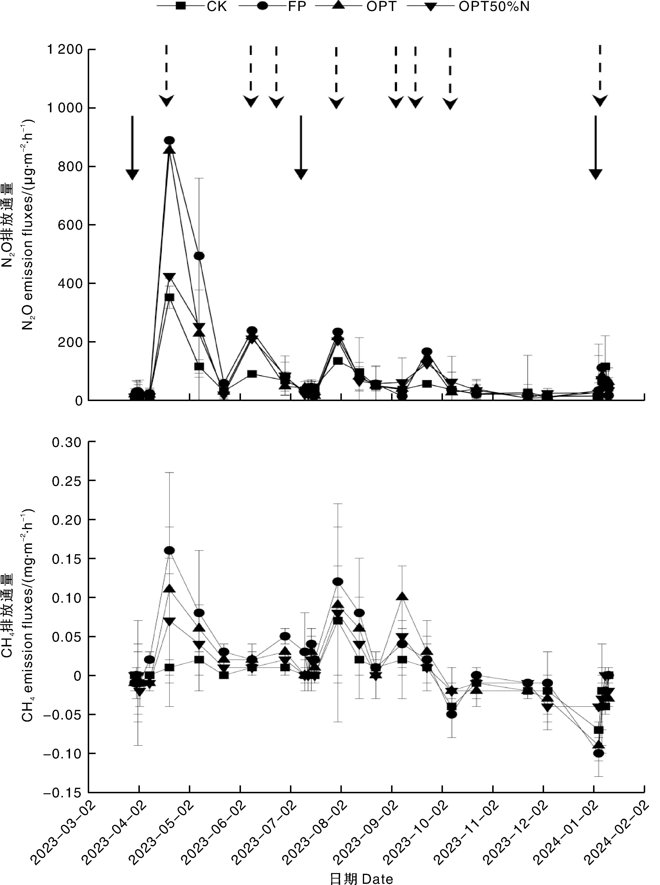 摘要: 为了探明适用于常山胡柚不同时期的专用肥配方及其对产量、品质、温室气体排放和土壤肥力的影响,本研究设置了4种施肥模式:CK,不施肥;FP,农户常规施肥;OPT,优化施肥;OPT50%N,在优化施肥的基础上施氮量减半。采用静态箱气相色谱法监测1年生育期内(2023年3月10日—2024年1月11日)的温室气体(N2O和CH4)排放。结果发现,与FP处理相比: OPT处理的果实产量未显著下降,果实品质提升,可滴定酸度显著(p<0.05)降低21.6%,固酸比和可食率分别显著提升27.7%、2.37百分点,CH4累积排放量和温室气体排放强度(GHGI)分别显著降低30.8%和33.3%,同时能够保证土壤有效养分的供给。OPT50%N处理虽然也能维持较高的果实品质和土壤有效养分的供给,且N2O累积排放量和CH4累积排放量较较FP处理分别显著降低30.9%、61.5%,但果实产量亦显著下降4.52%。综上,OPT处理既能保证果实产量,还能实现提质减排协同,可以开发为专用肥产品。该处理的化肥养分总投入量较FP减少24.4%,有效实现了化肥的减量增效。