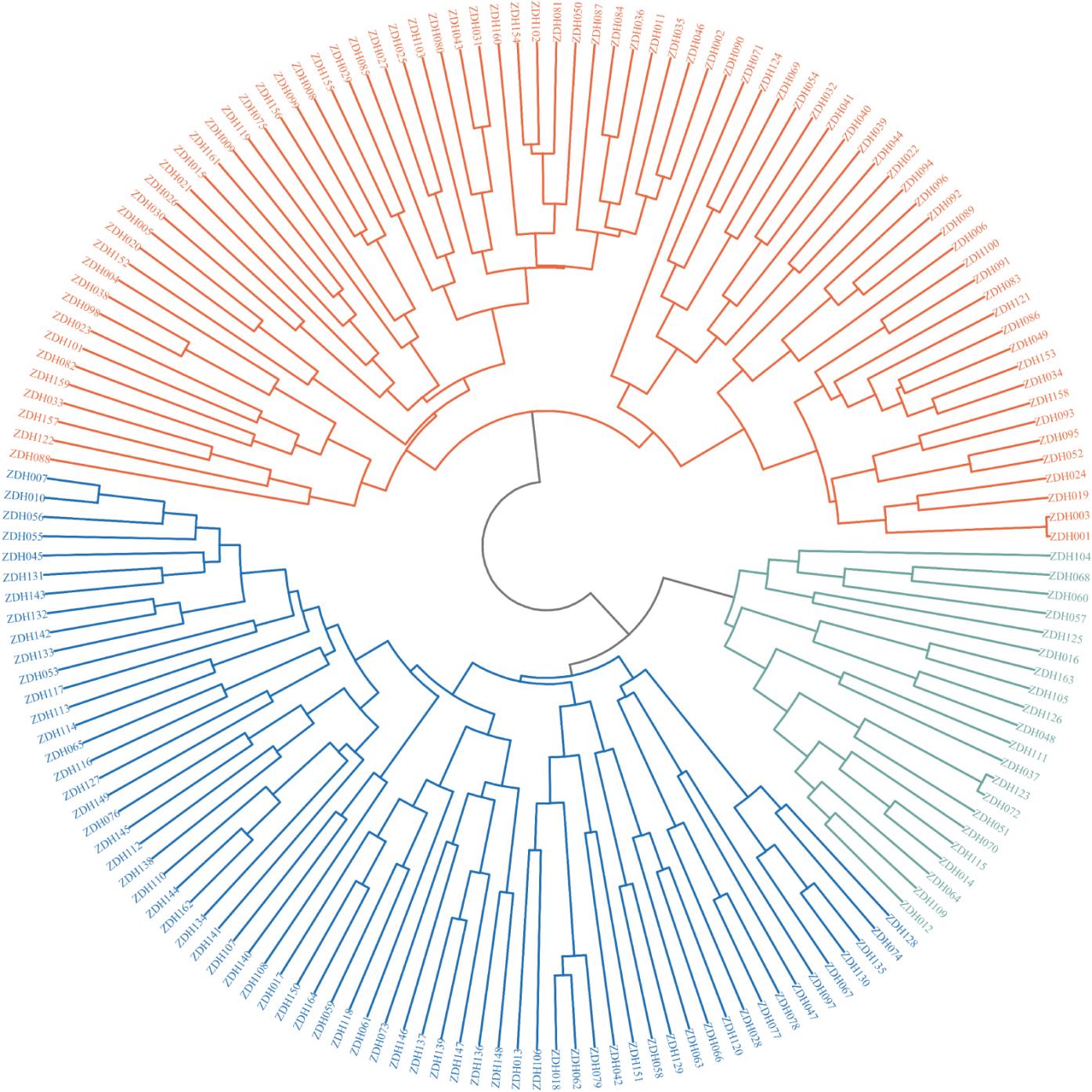 为给朱顶红属种质资源鉴定和育种策略制定提供科学依据,本研究综合采用主成分分析、相关分析和聚类分析,基于29项表型性状对164个朱顶红品种开展特异性、一致性、稳定性(DUS)测试。结果显示,个体测量性状的品种内变异系数为5.22%~15.57%,花:花梗长度的Shannon-Wiener多样性指数最大,为1.90。在群体目测性状中,Shannon-Wiener多样性指数排前3的依次为花:外花被片形状(1.865)、花:颜色分布(1.724)、花:内侧主色(1.705)。从29项表型性状中提取到8个主成分,其累积贡献率为66.95%,在这8个主成分上载荷最大的因子分别为花:外花被片宽度、花柱:颜色、花:直径、花:花冠正面形状、花序:花数、花序梗:基部花青甙显色、花:外花被片形状、花:颜色分布。供试性状中,花:颜色分布、花:外花被片形状除了与少数性状具有极显著(p<0.01)相关性外,与其他大部分性状没有显著相关性。聚类分析将164个品种分为3个类群,分别包含78、65、21个品种。