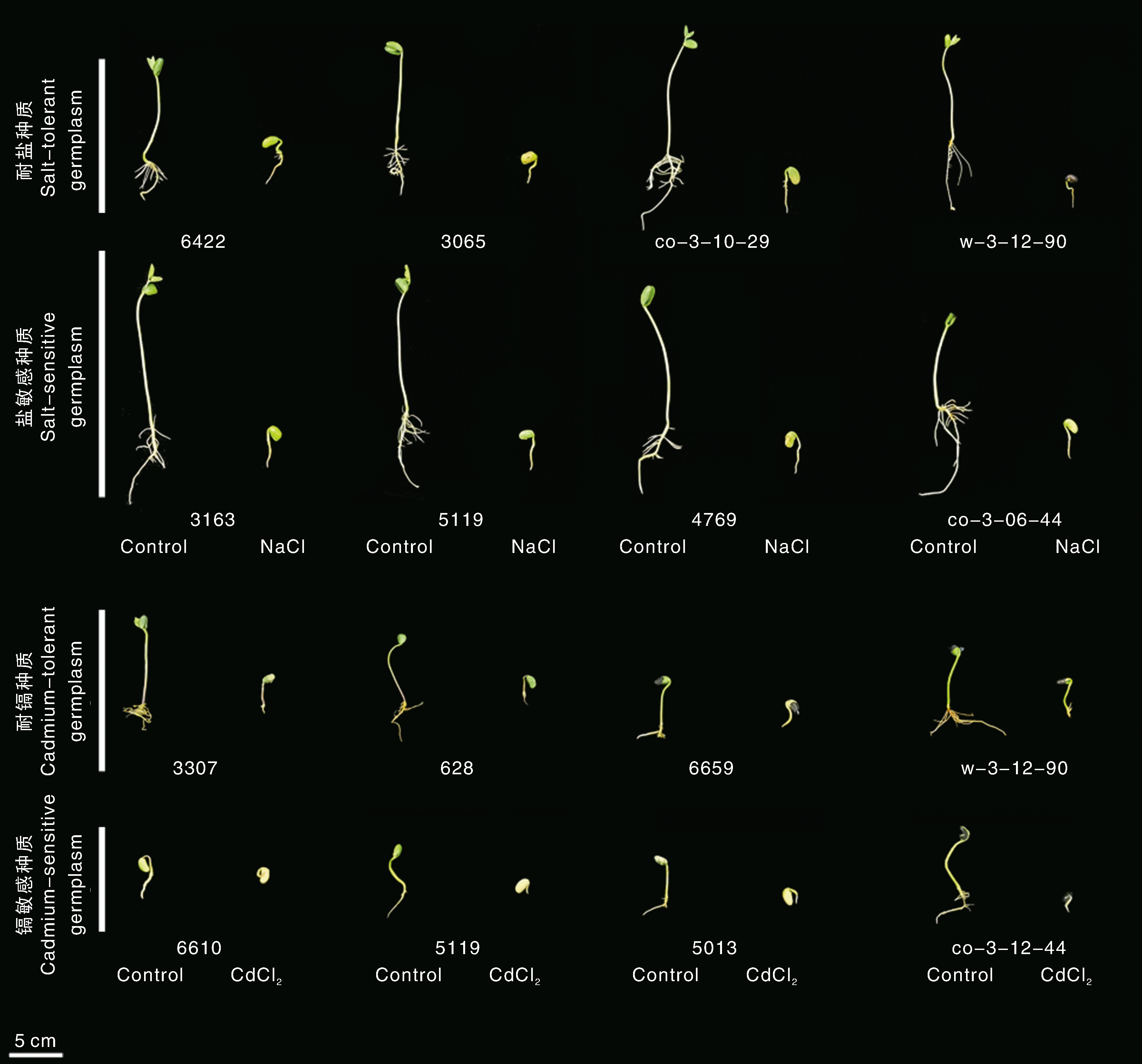 图1 不同大豆种质幼苗在盐或镉胁迫下的生理表现 盐、镉胁迫8 d后耐盐和耐镉品种,以及盐、镉敏感品种大豆幼苗的生理表现。NaCl,盐胁迫条件;CdCl2,镉胁迫条件;Control,正常生长条件。