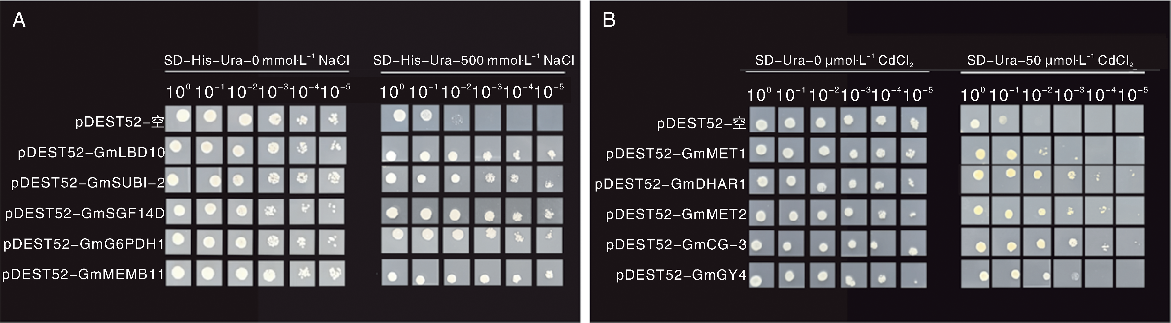 图2 转化大豆文库的酵母菌株在不同生长条件下的生长表现 A,大豆全长cDNA文库转化酵母G19菌株在含500 mmol·L-1 NaCl的SD-His-Ura培养基上的存活情况;B,大豆全长cDNA文库转化酵母Δycf1菌株在含50 μmol·L-1 CdCl2的SD-Ura培养基上的存活情况。照片拍摄于点板后第3天。