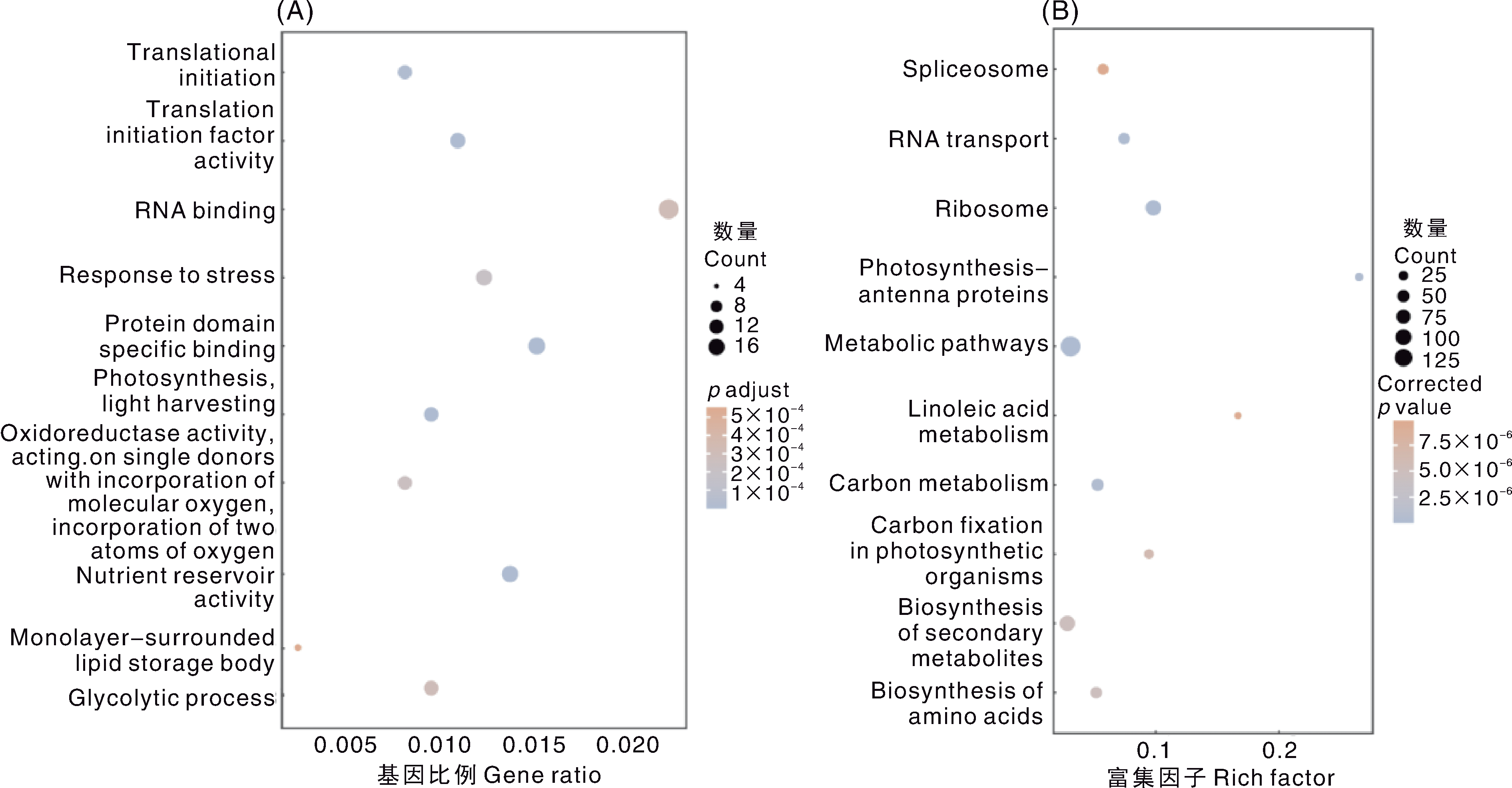 Fig.3 GO and KEGG analysis of candidate genes for salt tolerance in soybean A, GO function clustering analysis; B, KEGG pathway enrichment analysis. The annotation names of Fig. A from top to bottom are as follows: Translational initiation; Translation initiation factor activity; RNA binding; Response to stress; Protein domain specific binding; Photosynthesis, light harvesting; Oxidoreductase activity, acting on single donors with incorporation of molecular oxygen, incorporation of two atoms of oxygen; Nutrient reservoir activity; Monolayer-surrounded lipid storage body; Glycolytic process. The annotation names of Fig. B from top to bottom are as follows: Spliceosome; RNA transport; Ribosome; Photosynthesis-antenna proteins; Metabolic pathways; Linoleic acid metabolism; Carbon metabolism; Carbon fixation in photosynthetic organisms; Biosynthesis of secondary metabolites; Biosynthesis of amino acids.
