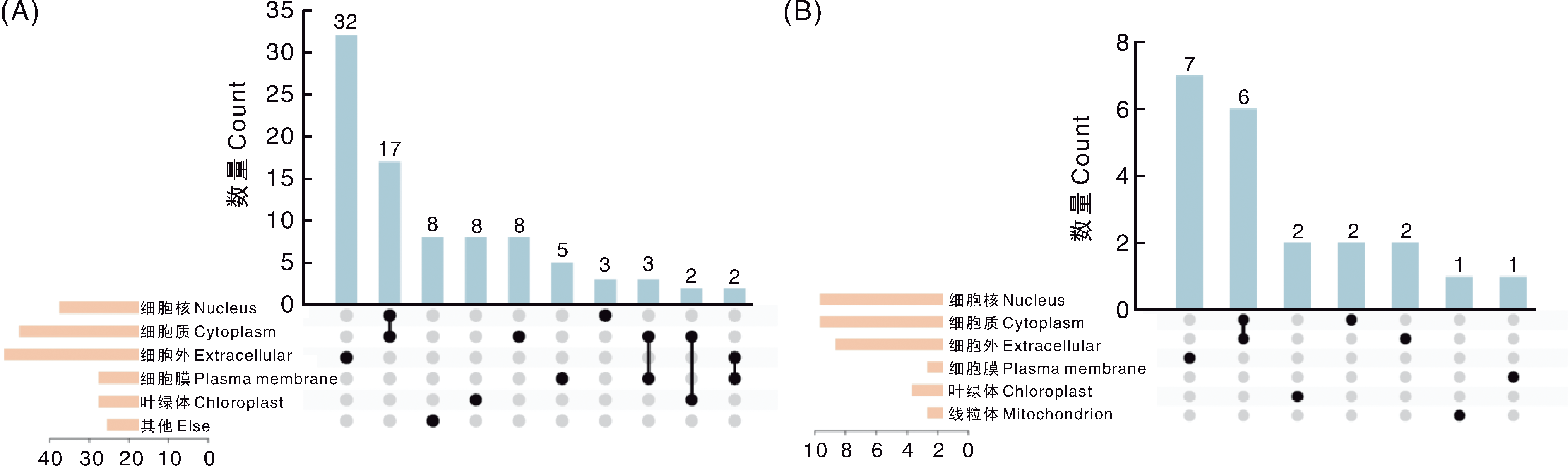 Fig.5 Subcellular localization of proteins encoded by soybean salt and cadmium tolerance candidate genes A, Subcellular localization of proteins encoded by known genes; B, Subcellular localization of proteins encoded by unknown genes.