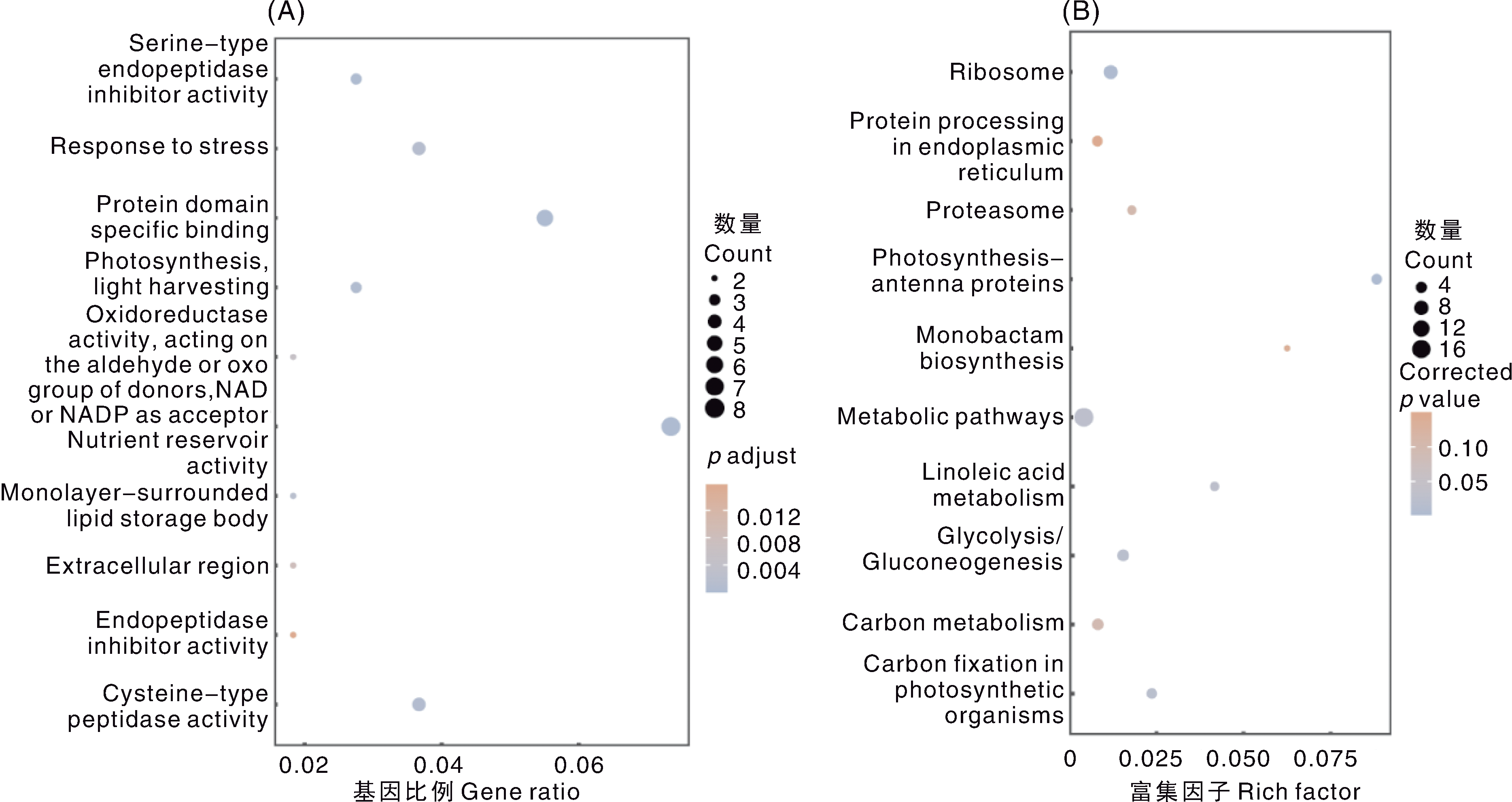 Fig.6 GO and KEGG analysis of candidate genes for salt-cadmium co-tolerance in soybean A, GO function clustering analysis; B, KEGG pathway enrichment analysis. The annotation names of Fig. A from top to bottom are as follows: Serine-type endopeptidase inhibitor activity; Response to stress; Protein domain specific binding; Photosynthesis, light harvesting; Oxidoreductase activity, acting on the aldehyde or oxo group of donors, NAD or NADP as acceptor; Nutrient reservoir activity; Monolayer-surrounded lipid storage body; Extracellular region; Endopeptidase inhibitor activity; Cysteine-type peptidase activity. The annotation names of Fig. B from top to bottom are as follows: Ribosome; Protein processing in endoplasmic reticulum; Proteasome; Photosynthesis-antenna proteins; Monobactam biosynthesis; Metabolic pathways; Linoleic acid metabolism; Glycolysis/Gluconeogenesis; Carbon metabolism; Carbon fixation in photosynthetic organisms. Gene ratio represents the ratio of differentially expressed genes annotated to a specific term to the total number of differentially expressed genes; Rich factor is the ratio of enriched differentially expressed genes in a pathway to all genes in that pathway. The same as below.