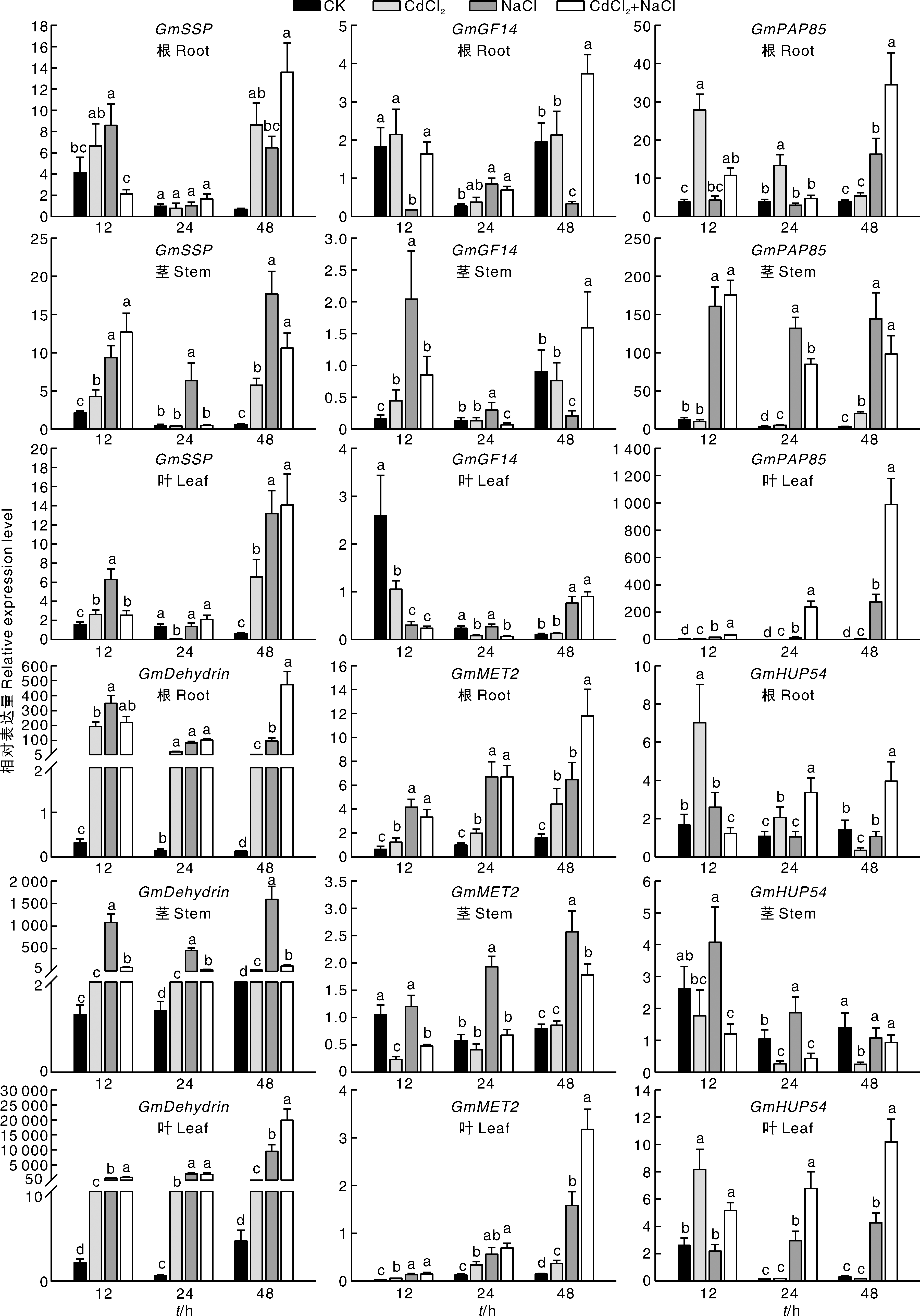 图7 盐、镉、盐+镉复合胁迫下大豆根、茎和叶中候选基因的相对表达水平 无相同小写字母表示同一个时间点在不同处理间差异显著(p<0.05)。