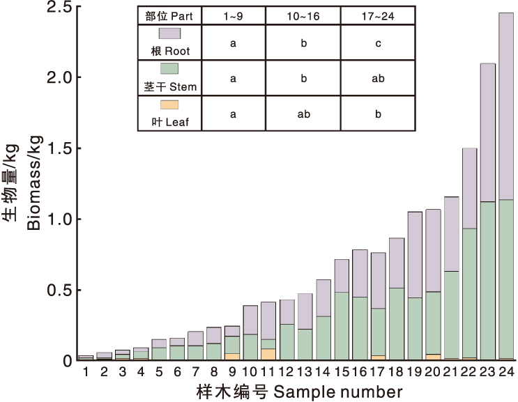 图3 不同地径茶树的生物量分配特征 样木1~9为小地径茶树,样木10~16为中地径茶树,样木17~24为大地径茶树。不同地径样木间(根/茎干/叶片)无相同字母的表示组间差异显著(p<0.05)。