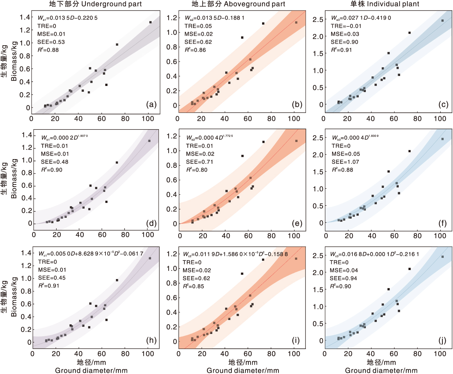 Fig.4 Fitting curves of ground diameter-biomass models for tea plants Figure a, b and c are linear function model; Figure d, e and f are power function model; Figure h, i and j are polynomial function model.