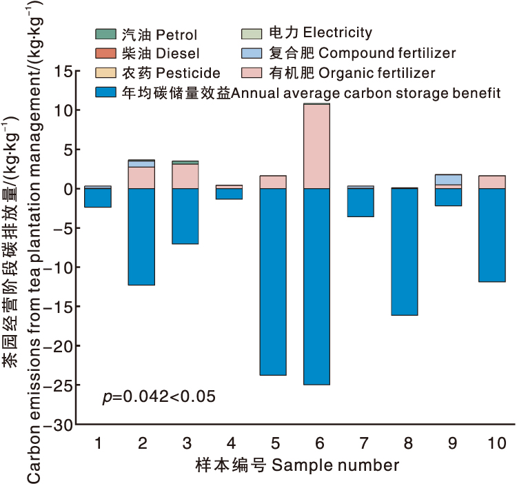 Fig.5 Carbon emissions during the tea garden management phase 1-6 are green teas, 7-10 are black teas. The same as Table 6.