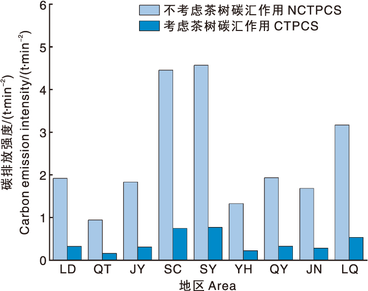 Fig.7 Carbon emission intensity of tea products in Lishui City LD, QT, JY, SC, SY, YH, QY, JN and LQ represent Liandu, Qingtian, Jinyun, Suichang, Songyang, Yunhe, Qingyuan, Jingning, and Longquan, respectively. NCTPCS and CTPCS refer to the scenarios of not considering and considering the carbon sequestration role of tea trees, respectively.