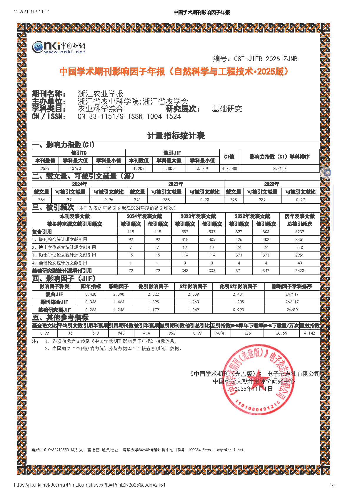 近日,《中国学术期刊影响因子年报(自然科学与工程技术·2025版)》发布,《浙江农业学报》表现亮眼,复合影响因子由上年度的2.058提升至2.390,影响力指数(CI)值达417.588,在全国117本农业科学综合类期刊中位列第20名,持续稳居Q1区。