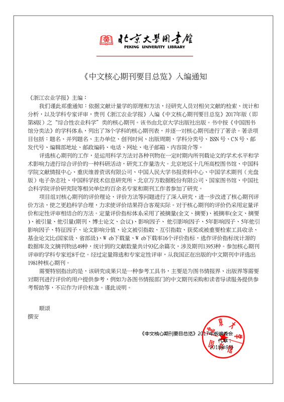 近日,接《中文核心期刊要目总览》2017年版编委会通知,《浙江农业学报》入选《中文核心期刊要目总览》2017年版(第8版)之“综合性农业科学”类的核心期刊。这是《浙江农业学报》自2008年以来连续第4次入选北大中文核心期刊。