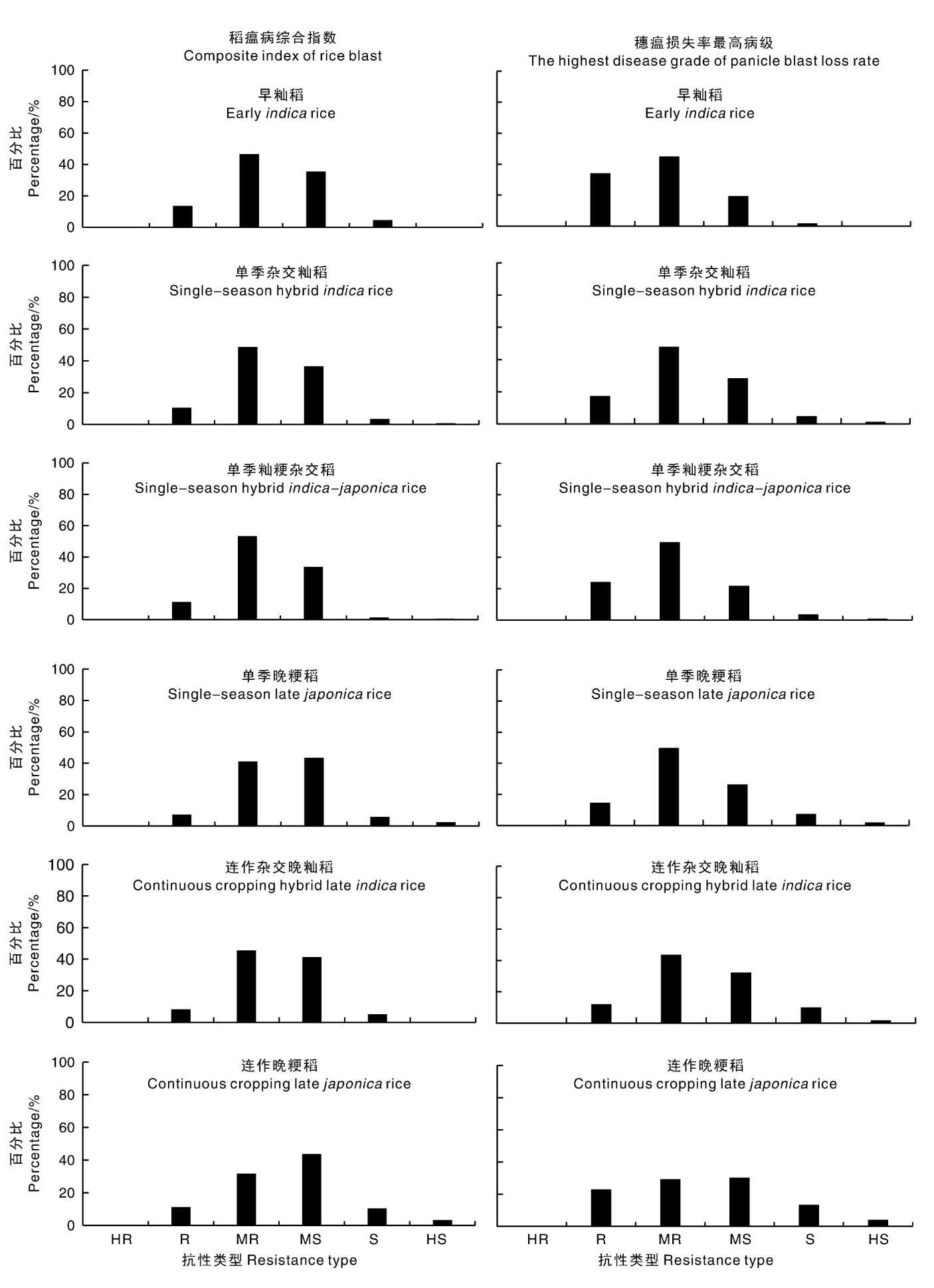 Fig.2 Distribution of overall resistance types of rice varieties based on the composite index of rice blast (top) and the highest disease grade of panicle blast loss rate (bottom) HR, Highly resistant; R, Resistant; MR, Moderately resistant; MS, Moderately susceptible; S, Susceptible; HS, Highly susceptible. The same as below.
