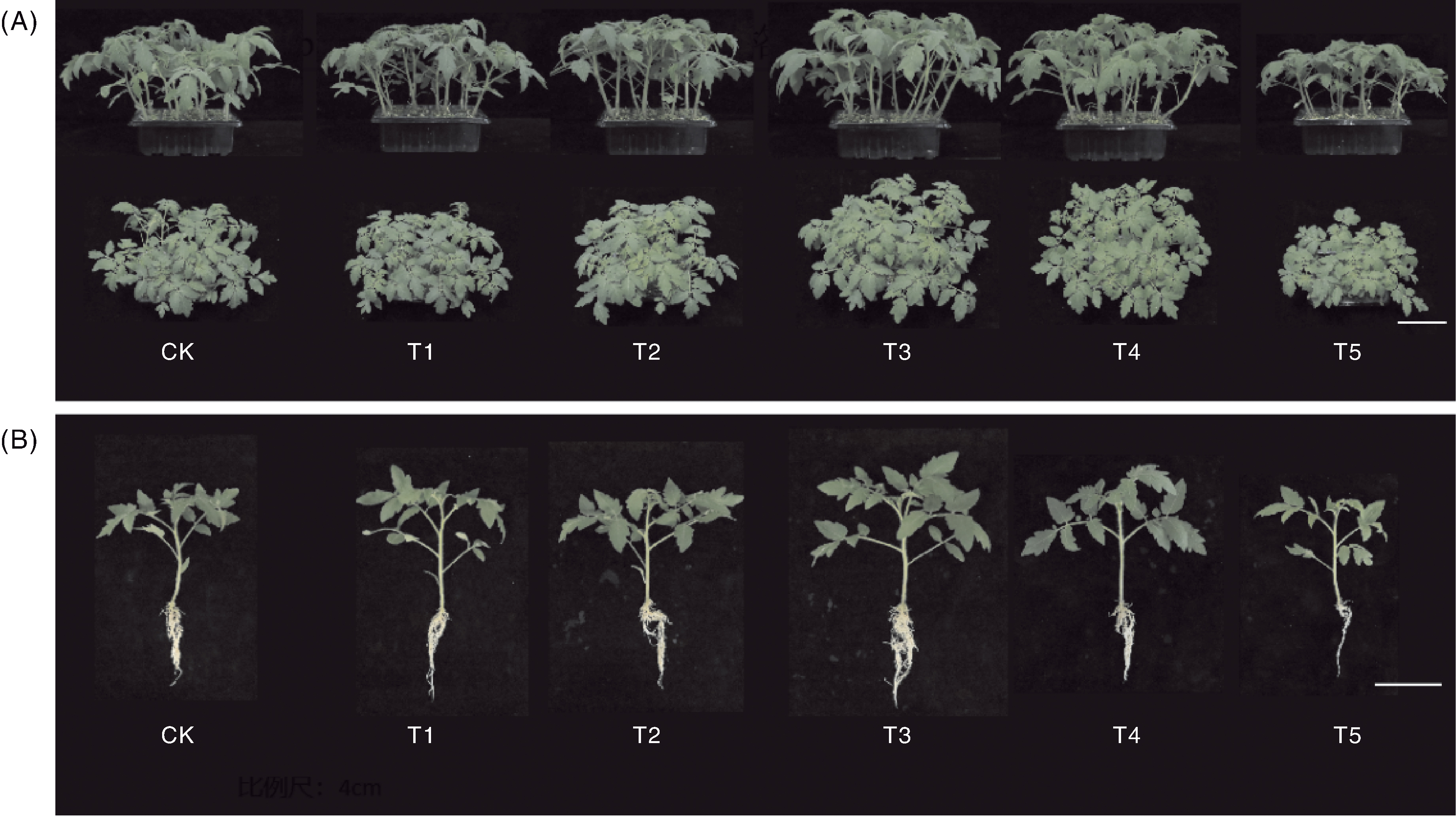 Fig.1 Phenotype of tomato seedlings under different treatments Figure A shows the front and top phenotype maps of overall tomato seedlings, figure B shows the front phenotype map of single tomato seedlings, with a scale of 4 cm. T1, T2, T3, T4, and T5 were treated with fish protein hydrolysate diluted 2 000, 1 600, 1 200, 800, and 400 times, respectively. CK was treated without adding fish protein hydrolysate. The same as Figures 2 to 7.