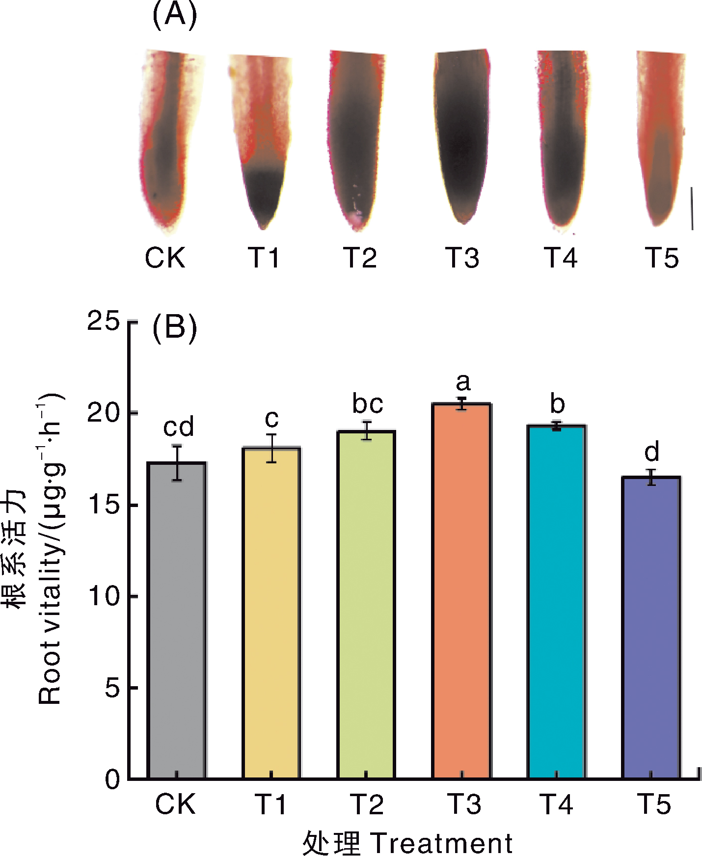 Fig.2 Root vitality of tomato under different treatments Figure A shows the staining of tomato root tips under a microscope, with a scale of 1 mm; Figure B shows the root vitality of tomato. The absence of identical lowercase letters above columns in the same group indicates significant (p<0.05) differences between treatments, the same as shown in Figures 3-7.