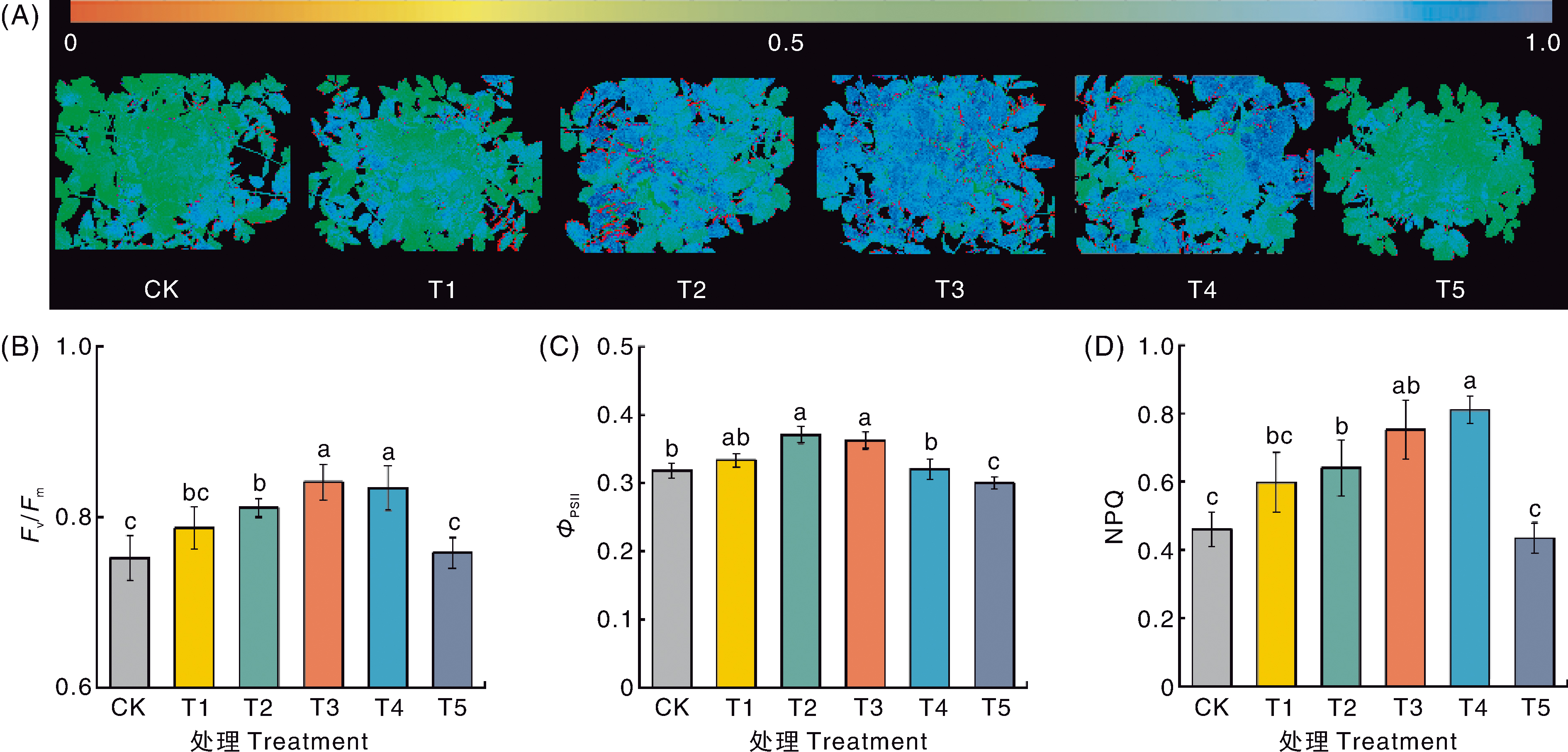 Fig.7 Chlorophyll fluorescence parameters of tomato seedlings under different treatments Figure A shows the imaging of the PSⅡ maximum photochemical efficiency(Fv/Fm), with values increasing as the color approaches deep blue; Figure B shows the PSⅡ maximum photochemical efficiency(Fv/Fm); Figure C shows the actual photochemical efficiency parameter (ΦPSⅡ); Figure D shows the non-photochemical quenching coefficient (NPQ).