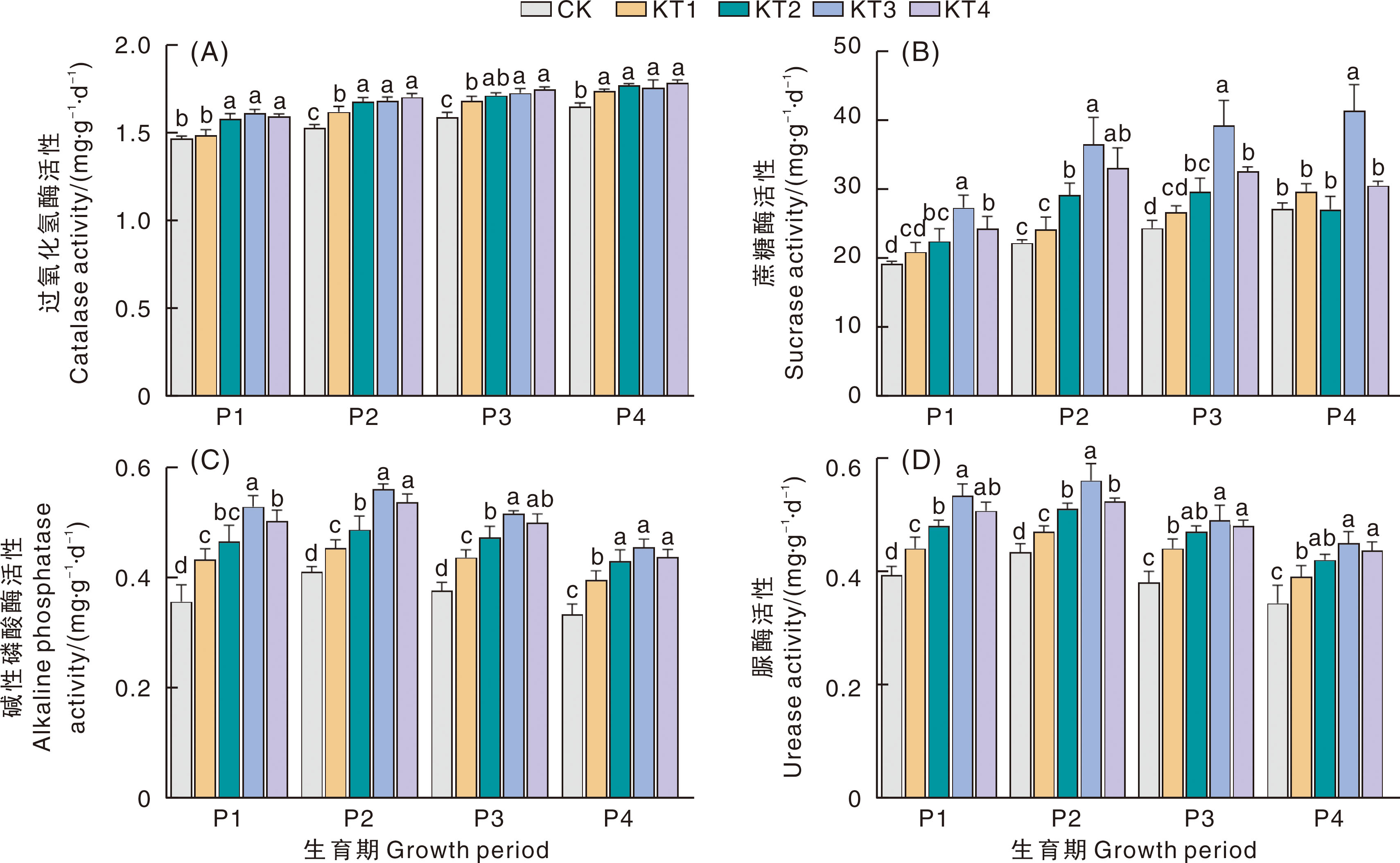 Fig.1 Effects of potassium fulvic acid on soil enzyme activity in melon root zone P1, P2, P3 and P4 represent vine extension stage, flowering stage, fruit expansion stage and maturity stage, respectively. Different lowercase letters above the columns represent statistically significant (p<0.05) differences among treatments during the same growth period.