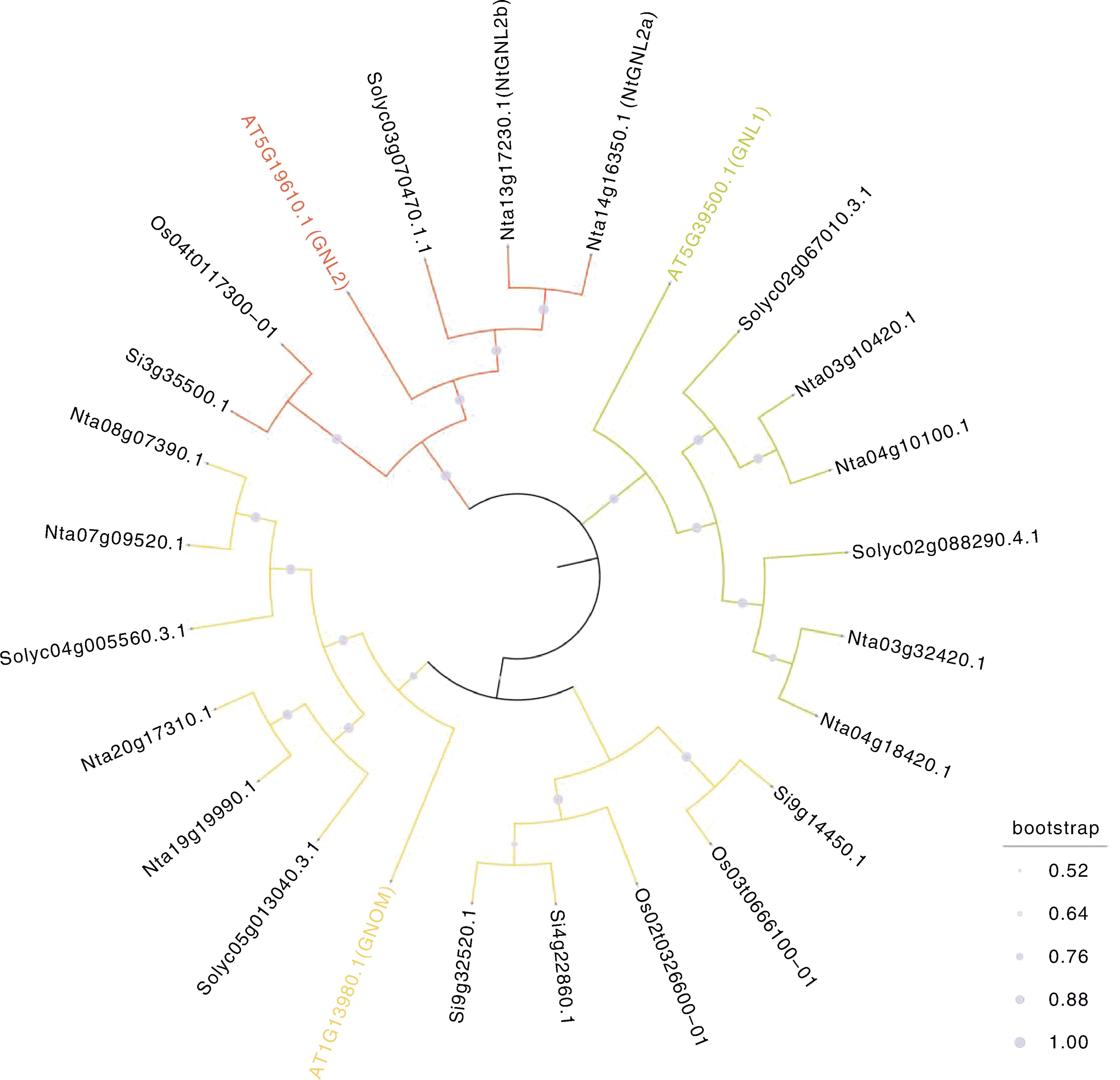 Fig.1 Phylogenetic tree of the ARF-GBFs of tobacco, Arabidopsis, tomato, rice, and millet Yellow represents GNOM clade; green represents GNL1 clade; red represents GNL2 clade. The blue circle represents the bootstrap value.
