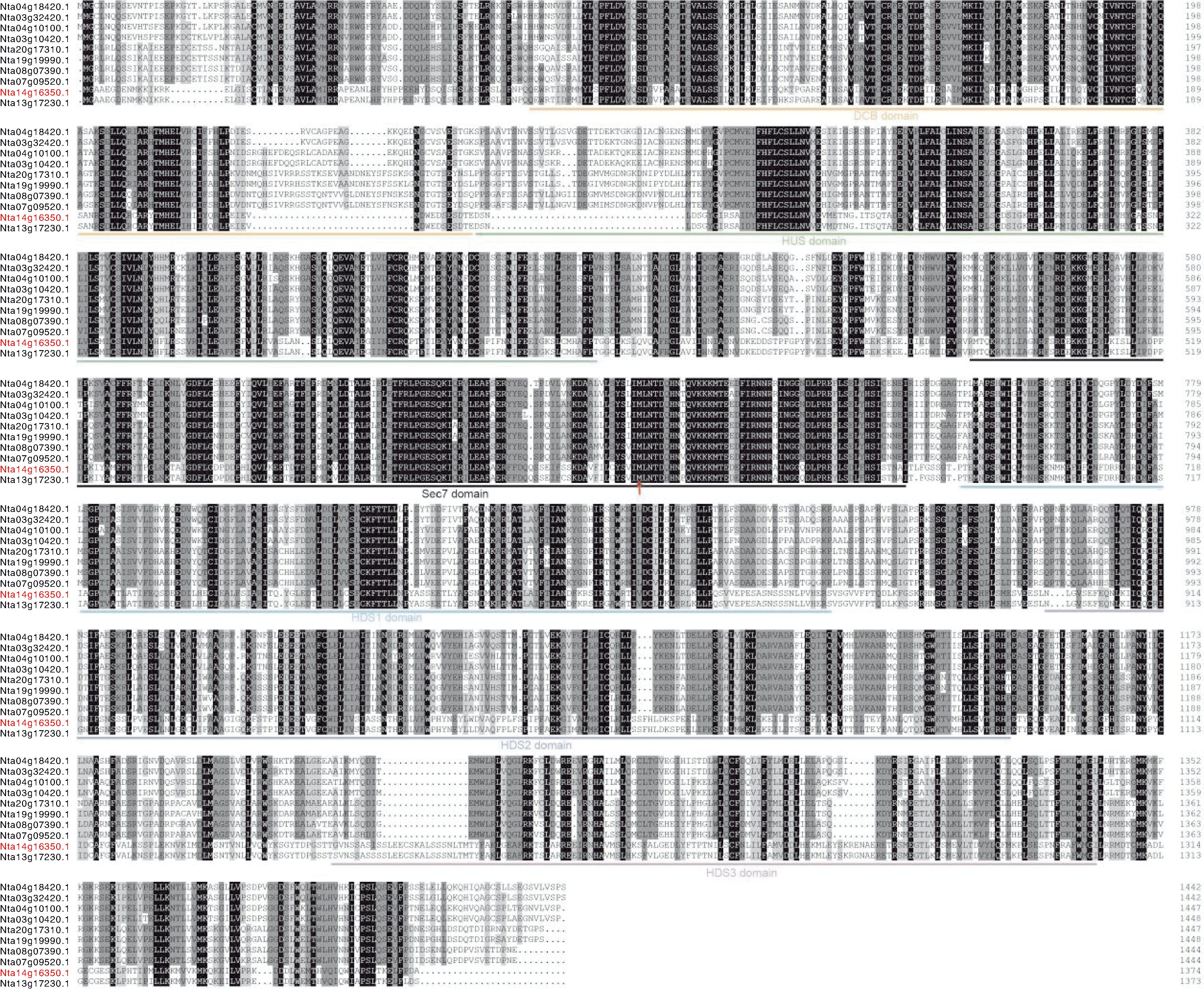 Fig.2 Multiple alignment of amino acid sequences of tobacco ARF-GBF members The conserved domains of the ARF-GBF protein are underlined in different colors. The red arrow indicates the typical amino acid in a BFA-sensitive ARF-GBF.