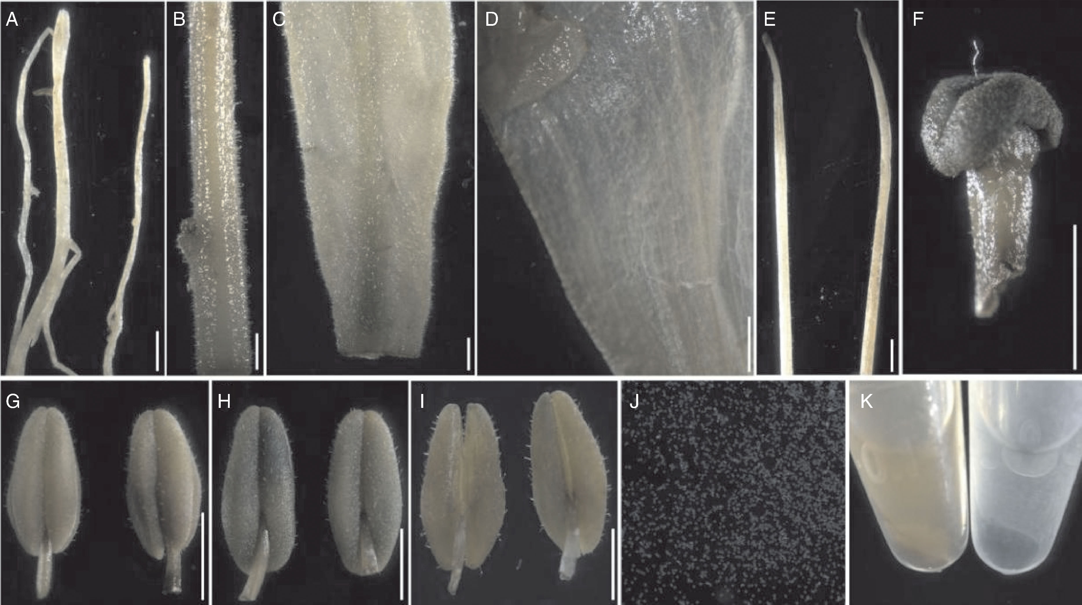 Fig.6 Histochemical GUS staining of transgenic tobacco A-F, Roots (A), stems (B), young leaves (C), petals (D), filaments (E), stigma (F) at full flowering stage; G-I, Anthers when the bud length is 3 cm(G), 4 cm(H), 5 cm(I); J, Transgenic pollen grains; K, GUS staining of pollen from wild-type (left) and transgenic lines (right). Scale: 0.2 cm.