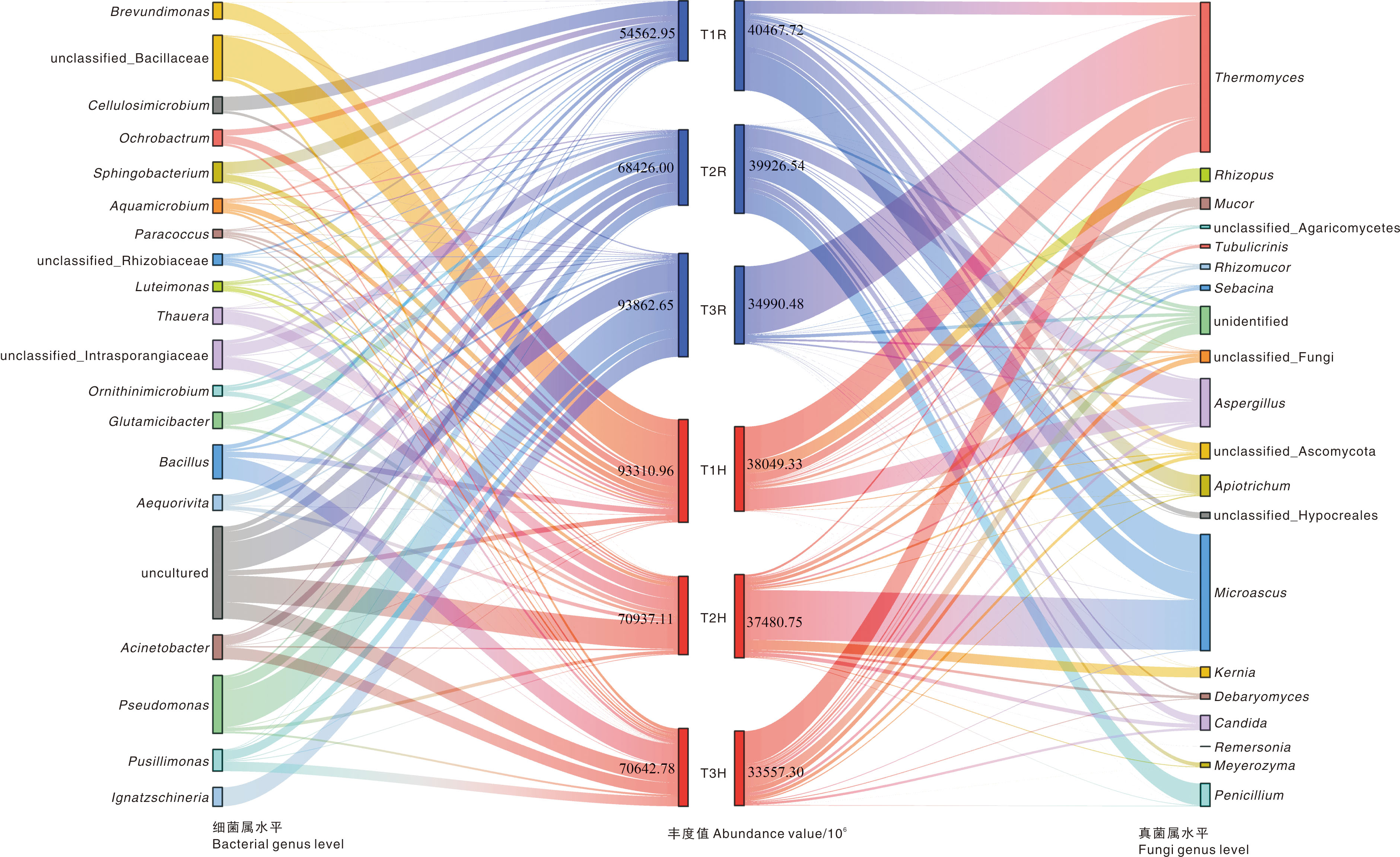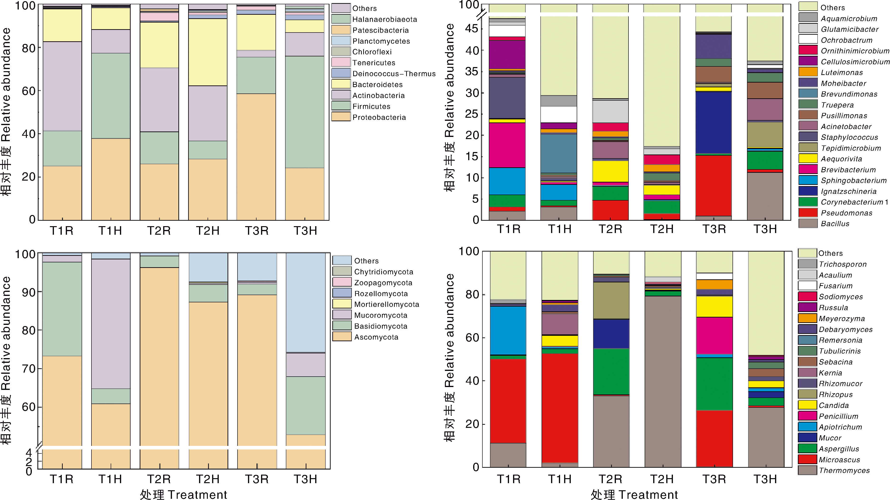 Based on the agro-industrial waste (vinasse, sawdust, by-product of monosodium glutamate, cow dung), mixtures with the initial pH of 6.00 (T1), 6.57 (T2) and 7.98 (T3) were prepared for composting. The field sampling, indoor physical and chemical analysis and high-throughput sequencing were combined to investigate the dynamic of physiochemical properties and microbial community during the composting. It was shown that the dominant bacteria phylum of T1 treatment changed from Actinobacteria to Firmicutes from temperature-rising stage to maturity stage, while the dominant bacteria genus remained as Brevibacterium. The dominant bacteria phylum of T2 treatment changed from Actinobacteria to Bacteroidetes from temperature-rising stage to maturity stage, and the dominant bacteria genus changed from Glutamicibacter to Corynebacterium. The dominant bacteria phylum of T3 treatment changed from Proteobacteria to Firmicutes from temperature-rising stage to maturity stage, and the dominant bacteria genus changed from Ignatzschineria to Bacillus. For fungi, Ascomycota was the dominant phylum for all treatments at the tempertaure-rising stage, high temperature stage and maturiy stage. At the maturity stage, the compost of T1 and T2 were acidic, while the compost of T3 was alkaline. The total nutrient (N+P2O5+K2O) content, heavy metals content, pH value and germination index of the compost under T1, T2 and T3 all met the standards of Organic Fertilizer(NY/T 525-2021). The research could provide reference for the further production of special fertilizer with specific pH value according to the properties of agro-industrial waste.