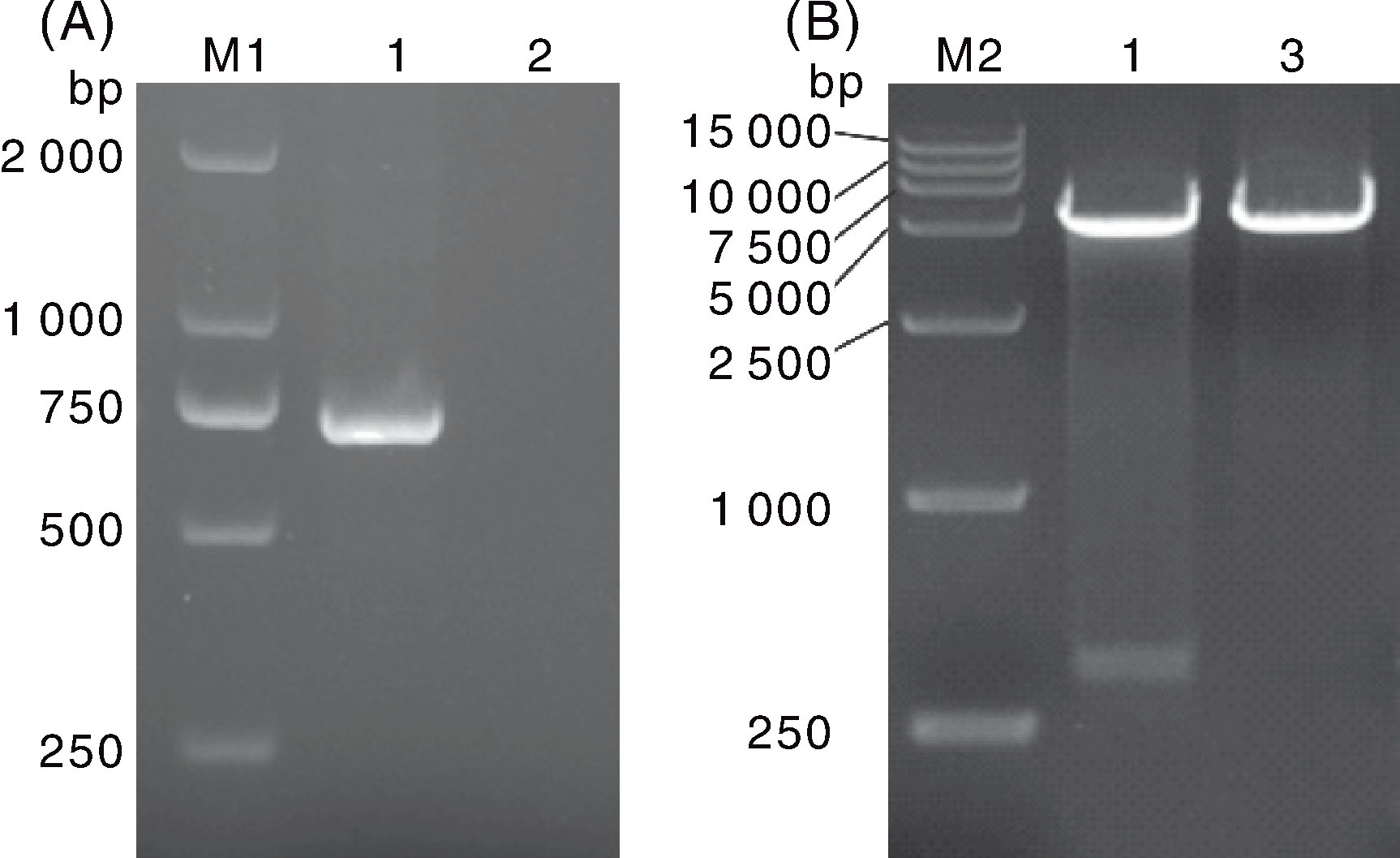 Fig.2 PCR (A) and restriction enzyme digestion (B) identification results of the recombinant plasmid M1, DL 2 000 DNA marker; M2, DL 15 000 DNA marker; 1, PCR products of pET-28-FPV-127; 2, Negative control; 3, pET-28.