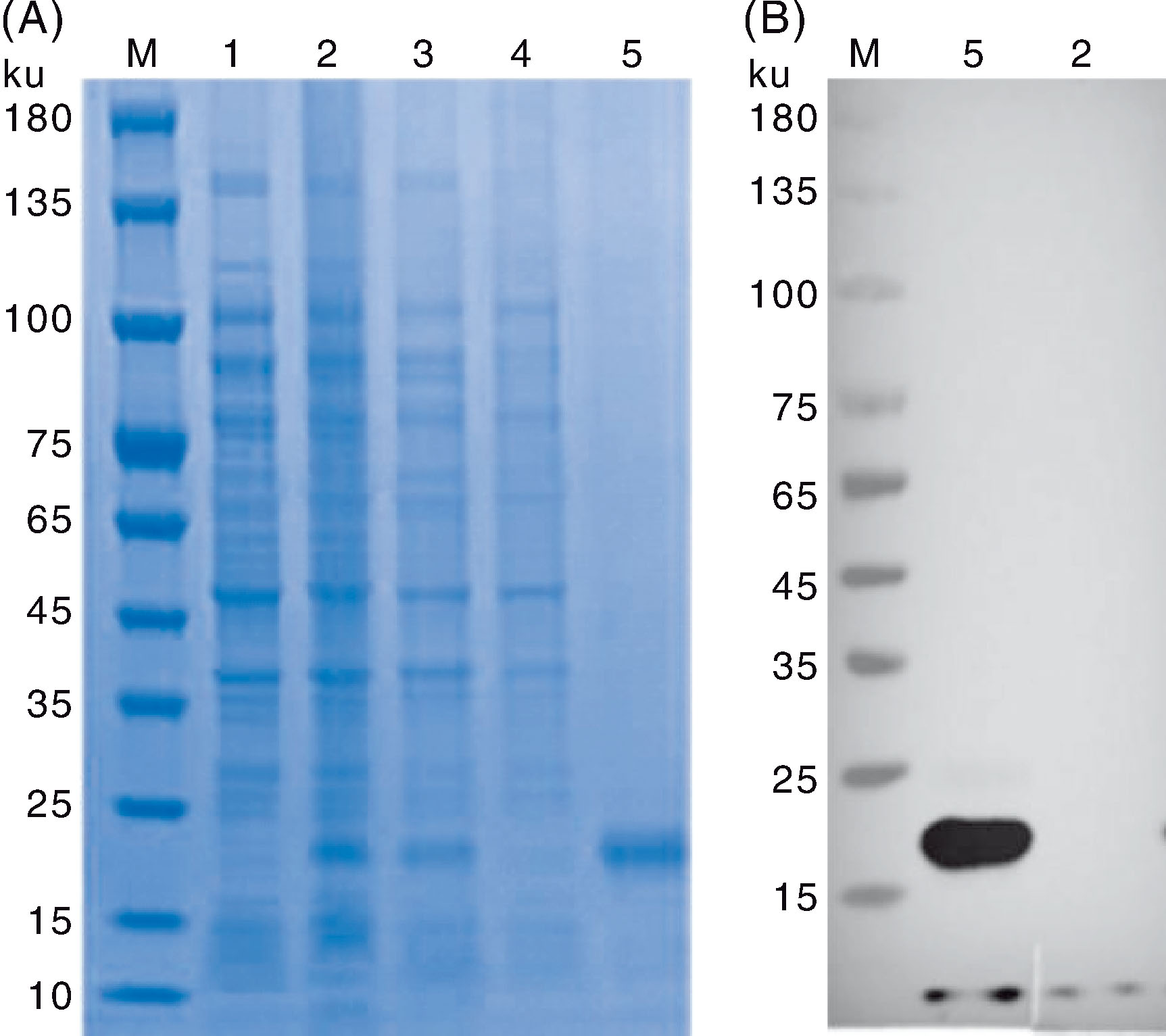 Fig.3 SDS-PAGE electrophoresis (A) and Western blot identification (B) of FPV-127 truncated protein M, Color prestained protein marker(10-180 ku); 1, Uninduced pET-28a-127/BL21; 2, Induced pET-28a-127/BL21; 3, Supernatant after cell lysis; 4, Precipitation after cell lysis; 5, FPV-127 truncated protein purified by nickel affinity chromatography.