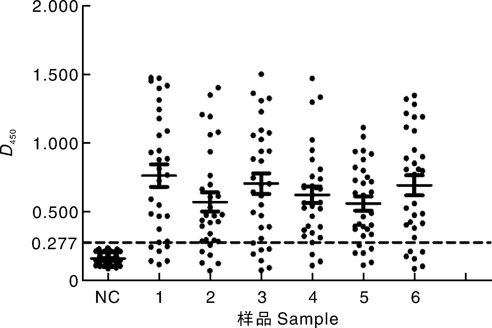 Fig.4 Indirect ELISA detection results of clinical samples NC, FPV negative serum samples; 1-6, Serum samples collected from each chicken farm after FPV vaccine immunization.