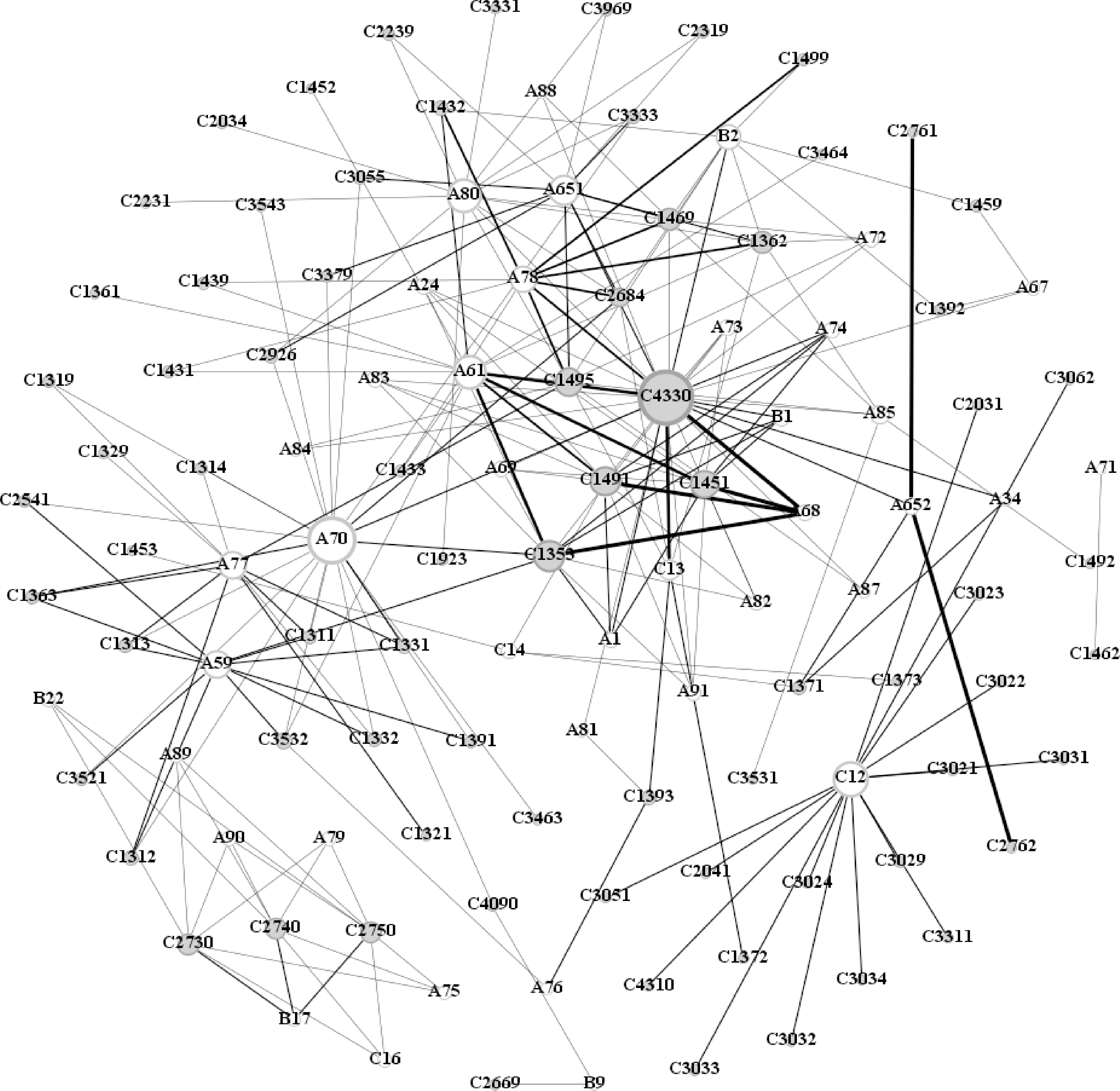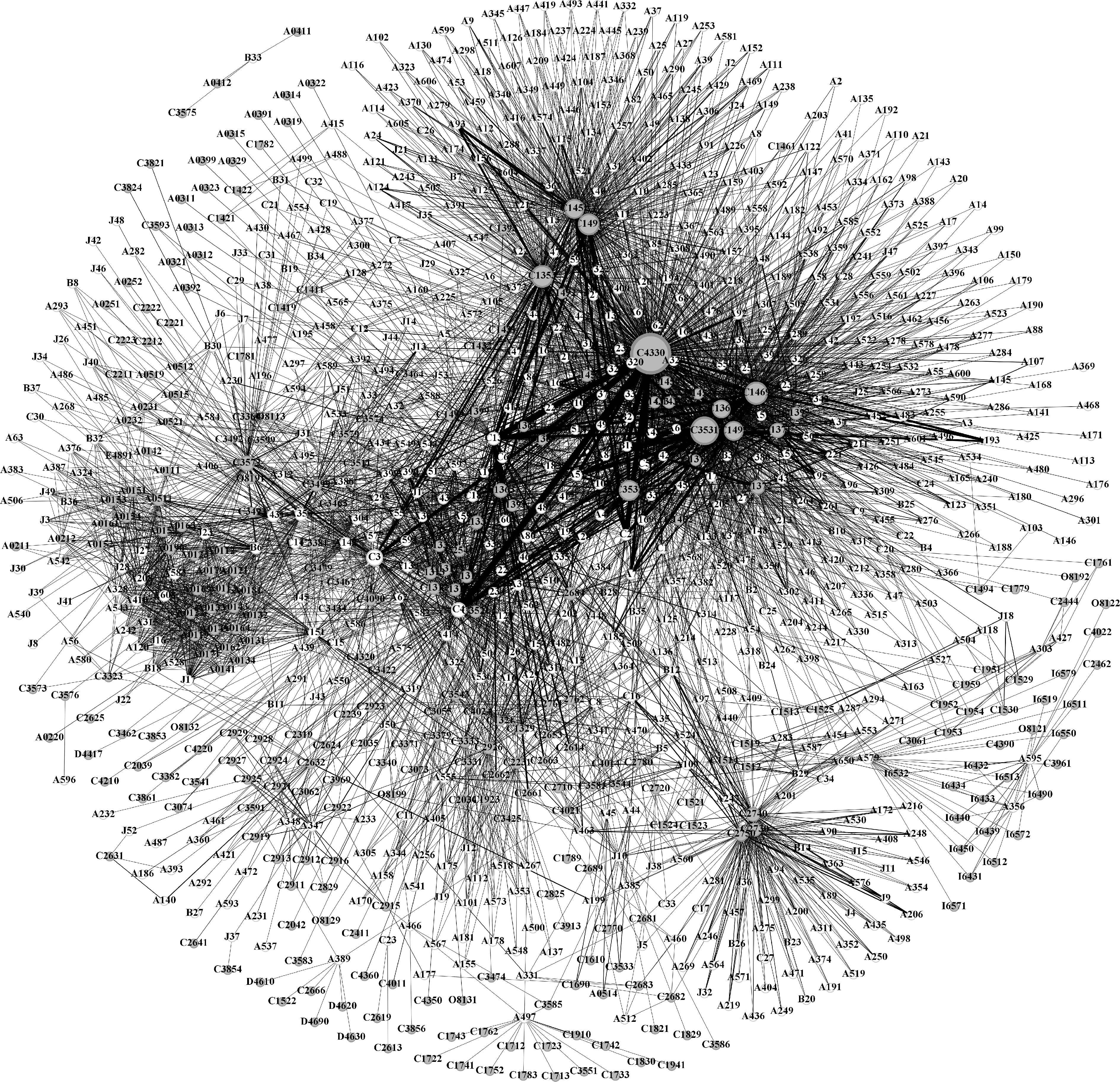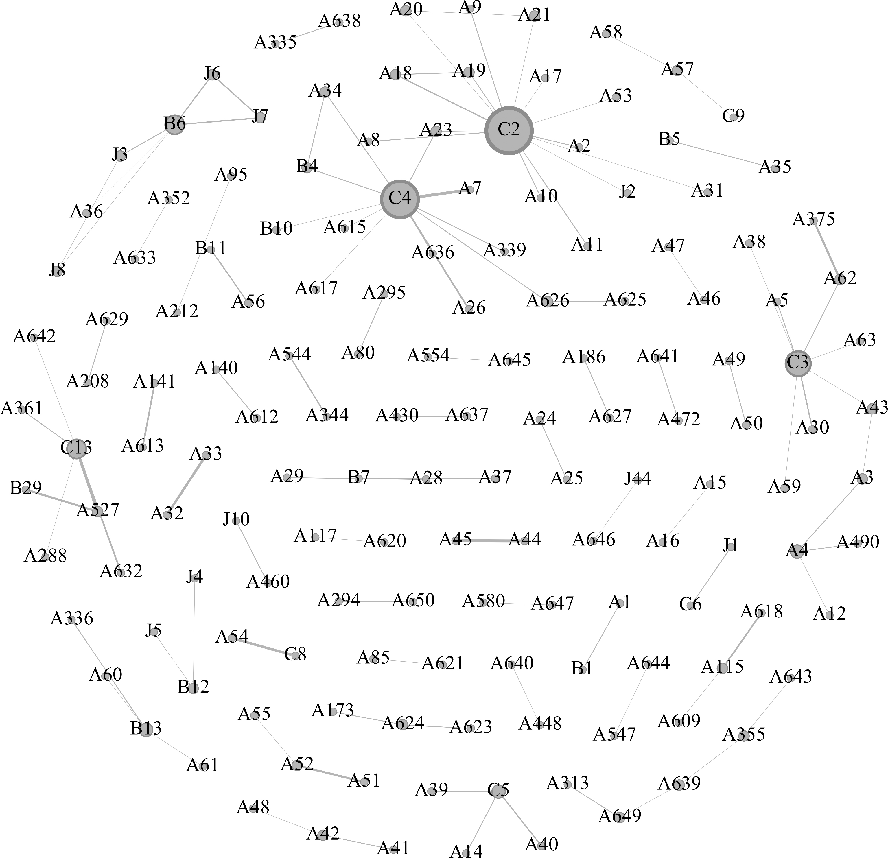 Fig.3 Topology of innovation cooperation network of Zanthoxylum bungeanum industry in Sichuan Province The letters A, B, C, and J in the code represent the four types of institutions: enterprises, scientific research institutes, colleges and universities, and other organizations and groups. The number in the code indicates the institution number. The width of the line indicates the strength of the cooperation. The same as below.