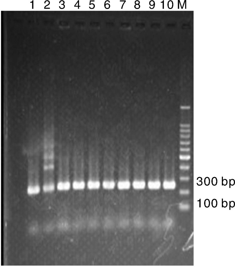 上游调控序列各片段PCR产物回收之后, 12个片段均介于120~200 bp之间, 符合预期大小。所有重组质粒的菌液PCR检测以pGL4.10载体上的pGL3+(TAGCAAAATAGGCTGTCCC)为上游引物, OVsR为下游引物, 12个重组载体中的目的片段大小存在一定差异, 所以经PCR扩增后, 正确的连接将会分别扩增出介于200~300 bp之间, 约为220 bp左右的片段。图2显示为其中一个表达载体PGL4-UP-2073菌液PCR呈阳性, 所有测序验证结果表明该载体构建成功。