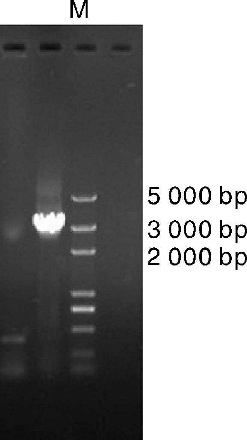 利用PCR方法克隆鸡卵清蛋白基因第一内含子-1 338~+1 798位置的目的片段, 纯化回收后电泳图。由图4可见, 目的基因长度为3 136 bp, 目的条带的位置符合预期, 克隆成功。