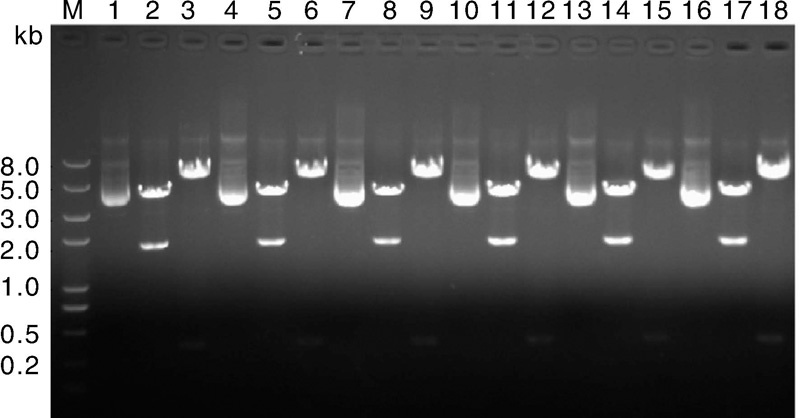 经过菌液PCR阳性筛选和测序验证之后, 将无序列突变质粒进行酶切鉴定, 如图5所示, 所有质粒的酶切检测均获得预期片段, 质粒构建成功。泳道1, 4, 7, 10, 13, 16为构建成功的质粒, 每个质粒后的2个泳道分别为相应质粒的限制性内切酶EcoR Ⅴ 单酶切和Kpn Ⅰ , EcoR Ⅴ 双酶切电泳图。