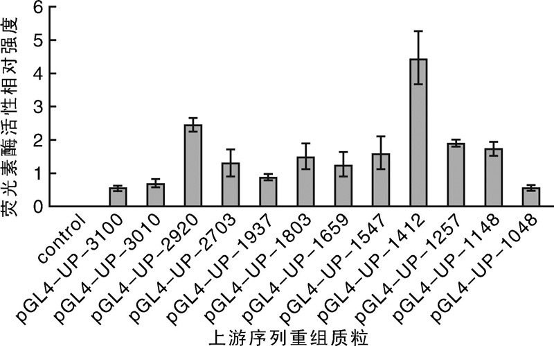 荧光素酶检测结果显示, 重组质粒pGL4-UP-1412表达活性最强(图8), 表明在鸡卵清蛋白基因上游-1 412~-1 251 bp序列部分可能存在有效调控元件。