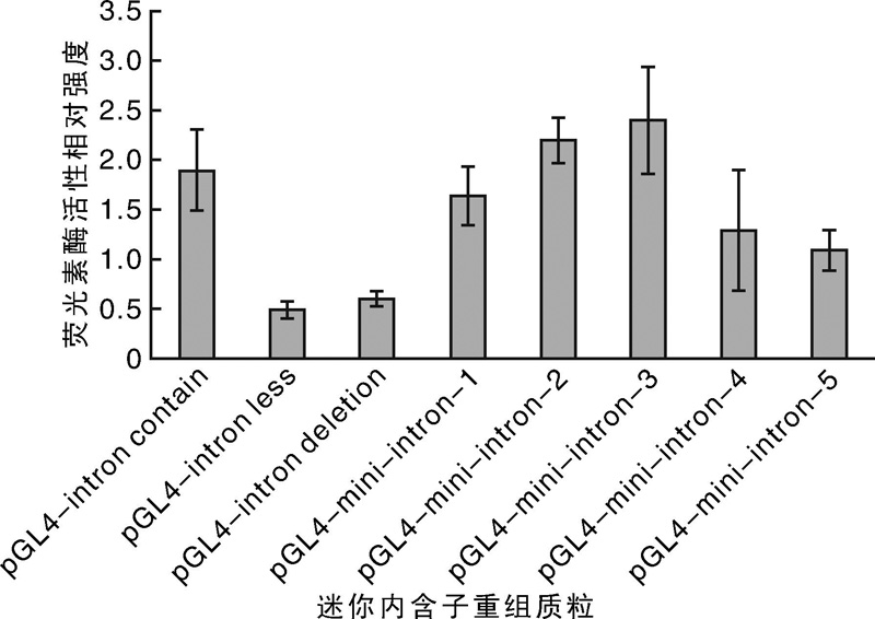 荧光素酶检测结果显示, 内含子重组质粒pGL4-mini-intron-3表达活性最强(图9), 说明在内含子+678~+1 008位置存在对转录活性有增强作用的区域。整体比较pGL4-mini-intron-1, pGL4-mini-intron-2, pGL4-mini-intron-3, pGL4-mini- intron-4和pGL4-mini-intron-5, 结果显示, 表达活性呈先降后升的趋势, 表明在+1 298~+1 628区域可能存在表达抑制性因子。同时推断出若干包含增强子序列区域。
