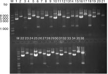 菌液鉴定为阳性的质粒经过测序验证, 选取测序无突变克隆子提取质粒, Kpn Ⅰ , EcoR Ⅴ 双酶切鉴定。所有质粒总长度均为5 000 bp左右, 经Kpn I, EcoR Ⅴ 双酶切后, 将质粒切成长度分别为4 020, 921和120~160 bp的3部分。由图3可见, 所有质粒的酶切检测均获得预期片段, 质粒构建成功。泳道1, 4, 7, 10, 13, 16, 19, 22, 25, 28, 31, 34为构建的12个重组质粒。每个质粒后的2个泳道分别为相应质粒的限制性内切酶EcoR Ⅴ 的单酶切和Kpn Ⅰ , EcoR Ⅴ 双酶切电泳图。