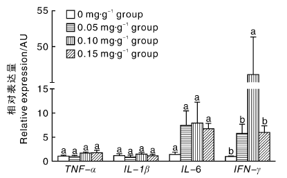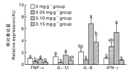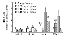 实验数据采用SAS 9.2软件进行统计分析, 结果用mean ± SE表示。荧光定量采用2-Δ Δ Ct法处理数据, 用GAPDH作为内参基因, 每个样品3个重复, 以对照组胸腺和脾脏组织基因表达量为1, 计算TNF-α 、IL-1β 、IL-6和IFN-γ 基因的相对表达量, 应用SAS 9.2统计分析软件中的MEANS过程进行描述性统计分析、单因素方差分析和Duncan's多重比较, P < 0.05表示差异显著。