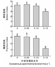 如图1所示, 注射0.15 mg· g-1亚精胺组鼠胸腺指数和脾脏指数显著(P < 0.05)低于对照组; 0.05 mg· g-1和0.10 mg· g-1亚精胺组鼠的胸腺指数和脾脏指数与对照组相比均没有明显变化(P > 0.05)。