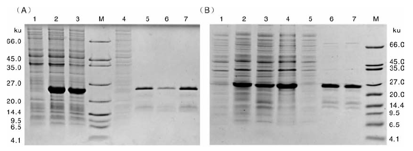对重组菌株pET32a(+)-pln J-BL21(DE3)和pET32a(+)-pln K-BL21(DE3)进行IPTG诱导表达及镍柱亲和纯化, 并做SDS-PAGE鉴定。如图3所示, 与未诱导的重组菌株相比, 诱导后重组菌株表达出目的蛋白条带。理论上, Trx-His6-pln J和Trx-His6-pln K的大小分别为22.7和23.5 ku, 图3中的目的蛋白条带均与理论值相符。经镍柱亲和纯化后的融合蛋白与未纯化时相比, 条带较为单一, 杂质已基本去除。