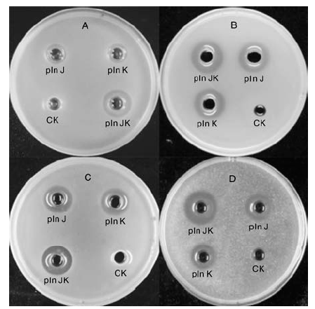 将冷冻干燥得到的细菌素pln J和pln K以0.05%乙酸溶解, 终浓度为20 μ mol· L-1。利用琼脂扩散实验[6]研究单独的pln J或pln K及plantaricin JK的抗菌效果, 指示菌分别为柠檬色葡萄球菌、大肠埃希菌、藤黄微球菌和单核细胞增生李斯特菌。