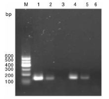pln J和pln K的基因PCR扩增结果如图1所示, 扩增片段大小均在100~200 bp之间, 与理论值基本相符, 阴性对照则没有出现特异性片段。