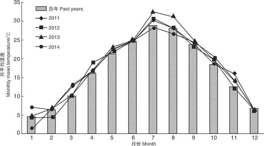 杭州, 位于中国东南沿海, 属亚热带季风气候, 四季分明, 光照充足, 年平均气温17.8 ℃。以具有庞大花卉苗木市场, 素有“ 中国花木之乡” 之称的萧山(杭州辖区)为例, 该地区历年来平均温度为16.8 ℃, 2011— 2014年的月平均温度1.3~32.6 ℃, 最低温出现在1月份, 但是该月份平均温度有逐年上升的趋势, 2014年1月份该数值为7.3 ℃(图1)。在美国, 通常把1月份的-17 ℃等温线作为红火蚁往美国北部入侵的北界。鉴于此, 从地区平均温度值来看, 红火蚁在杭州地区能越冬的可能性非常大。而且, 前人研究表明, 红火蚁无论是行为还是生理上均体现了较强的抗寒能力, 例如蚁丘精巧的结构, 使得蚁丘像个热的“ 绝缘体” , 因而红火蚁可以出现在蚁丘顶部温度为-2~-4 ℃寒冷的地方[40]。而且红火蚁的过冷却点低于-6 ℃, 并且大部分是-9~-20 ℃[40, 41, 42], 这也为红火蚁越冬存活起到重要作用。