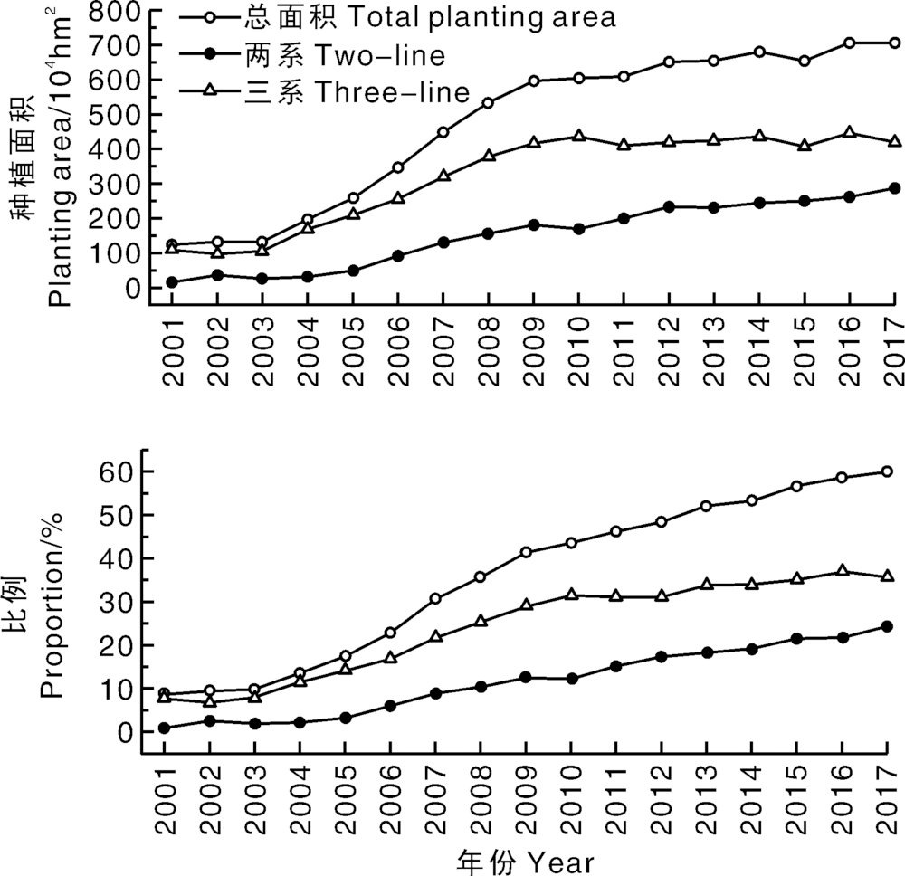 从图1可知, 2001— 2017年, 优质杂交稻推广面积和所占杂交稻总面积比例都呈现逐年增加的趋势。优质两系和三系组合的种植面积分别由2001年的14.8万hm2、108.4万hm2增加到2017年的286.7万hm2、419.5万hm2; 优质杂交稻所占比例2001年不足10%, 2017年达到60%。