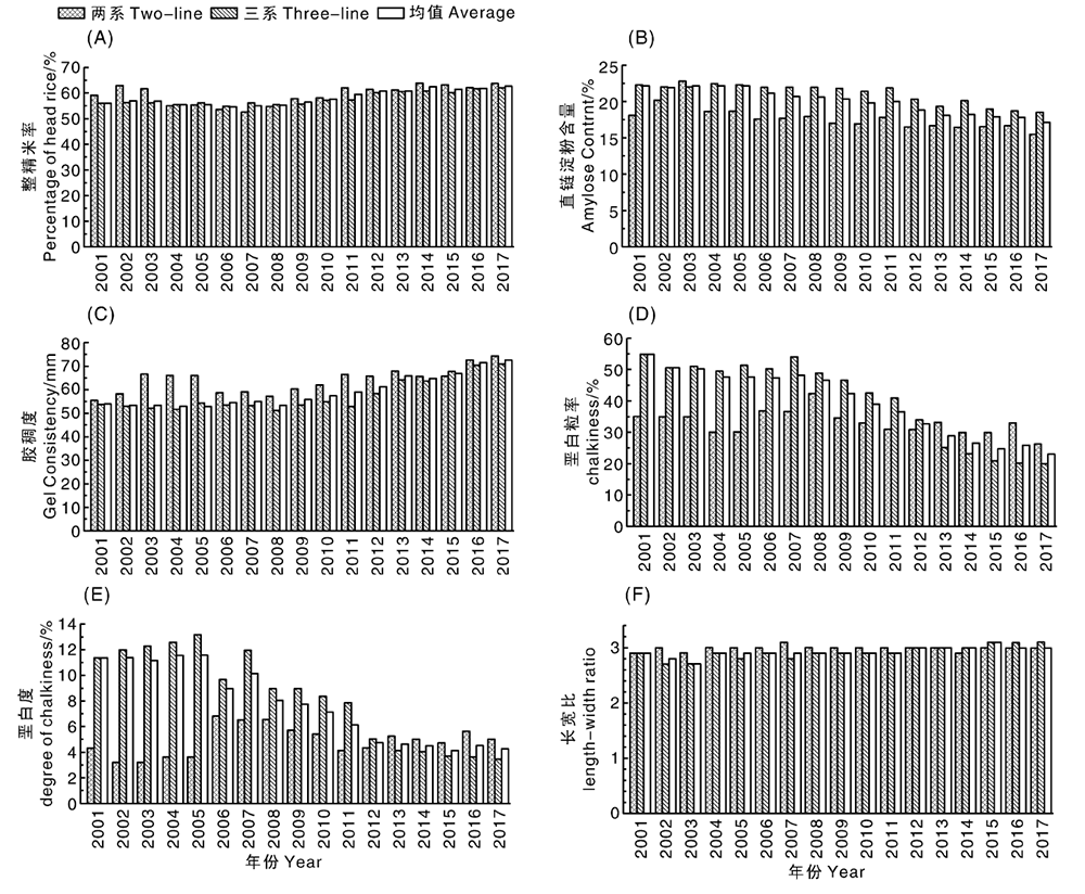 2001年到2017年, 三系杂交组合谷粒长宽比增加(图2-F), 2001— 2011年为2.7~2.9, 2015年达到了3.1, 如四川省主推优质组合— — 川优6203谷粒长宽比达到3.5, 米质国标2级。两系组合无显著变化, 部分优质组合表现突出, 比如两优287和隆两优华占的谷粒长宽比为3.5和3.3。