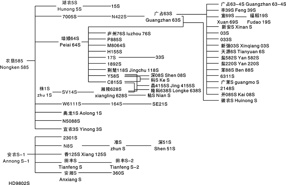 51个不育系中48个系谱关系明确, 对48个不育系(图5中加粗标出)进行分析得知, 其中38个不育系由农垦58S衍生, 9个由安农S-1衍生, 有2个兼有农垦58S和株1S的血统, HD9802S无衍生系。影响力最大的广占63S及其衍生系18个, 配组组合推广面积达1 333.4万hm2, 其中4个组合推广面积均超过133.3万hm2。培矮64S及其14个衍生系所配组合累计推广面积达990.3万hm2, 其中3个组合超过66.7万hm2。安农S-1衍生系7个所配组合合计推广面积达52.1万hm2。HD9802S是早籼型优质不育系, 所配组合累计推广126.1万hm2(表6)。