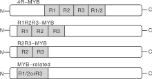 MYB转录因子分类中, 以c-Myb转录因子所含的3个重复R1、R2、R3为重复原型, 其他的MYB转录因子根据所含MYB重复的数量, 及与原型重复的相似性分为4个亚类(图2), 分别为4R-MYB、R1R2R3-MYB、R2R3-MYB和1R-MYB[5]。1R-MYB亚组只包含一个R结构域, 称为1R-MYB/MYB-related。这些MYB蛋白是重要的端粒结合蛋白, 在维持染色体结构完整性和调控基因转录方面发挥着重要作用[6], 对于细胞和组织形态发生、周期节律具有重要的生物学意义。MYB转录因子的亚类R2R3-MYB是MYB转录因子家族中数量最多的一个亚类, 拟南芥中大约有120多个, 水稻中也有90多个。它们都包含两个R结构在蛋白的N-末端— — R2R3, 通常蛋白的C端有着转录激活功能, 它们广泛参与细胞分化、激素响应、次生代谢、环境胁迫和抗虫抗病等过程[7]。含有3个R结构域的MYB转录因子亚类R1R2R3-MYB在植物中含量相对较少, 已知高等植物拟南芥、水稻、烟草的基因组仅编码5个3R-MYB基因。它们的功能主要是参与细胞周期和细胞分化, 也与植物对逆境的耐受性密切相关。第四个亚类4R-MYB的数量最少, 只在拟南芥、葡萄和杨树中有发现有单个的4R-MYB, 它们的功能也知之甚少[8]。